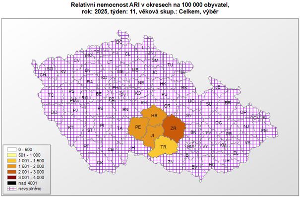 Krajská hygienická stanice kraje Vysočina (KHSV) eviduje za 46. týden letošního roku v regionu 922 nových případů akutních respiračních infekcí na 100 tis. obyvatel. Nejvíce nových případů je evidováno na Žďársku (1 056 případů na 100 tis. obyv.), Havlíčkobrodsku (947 případů na 100 tis. obyv.) a Jihlavsku (922 případů na 100 tis. obyv.). V okrese Pelhřimov je evidováno 916 a na Třebíčsku 754 nových případů na 100 tis. obyvatel.
